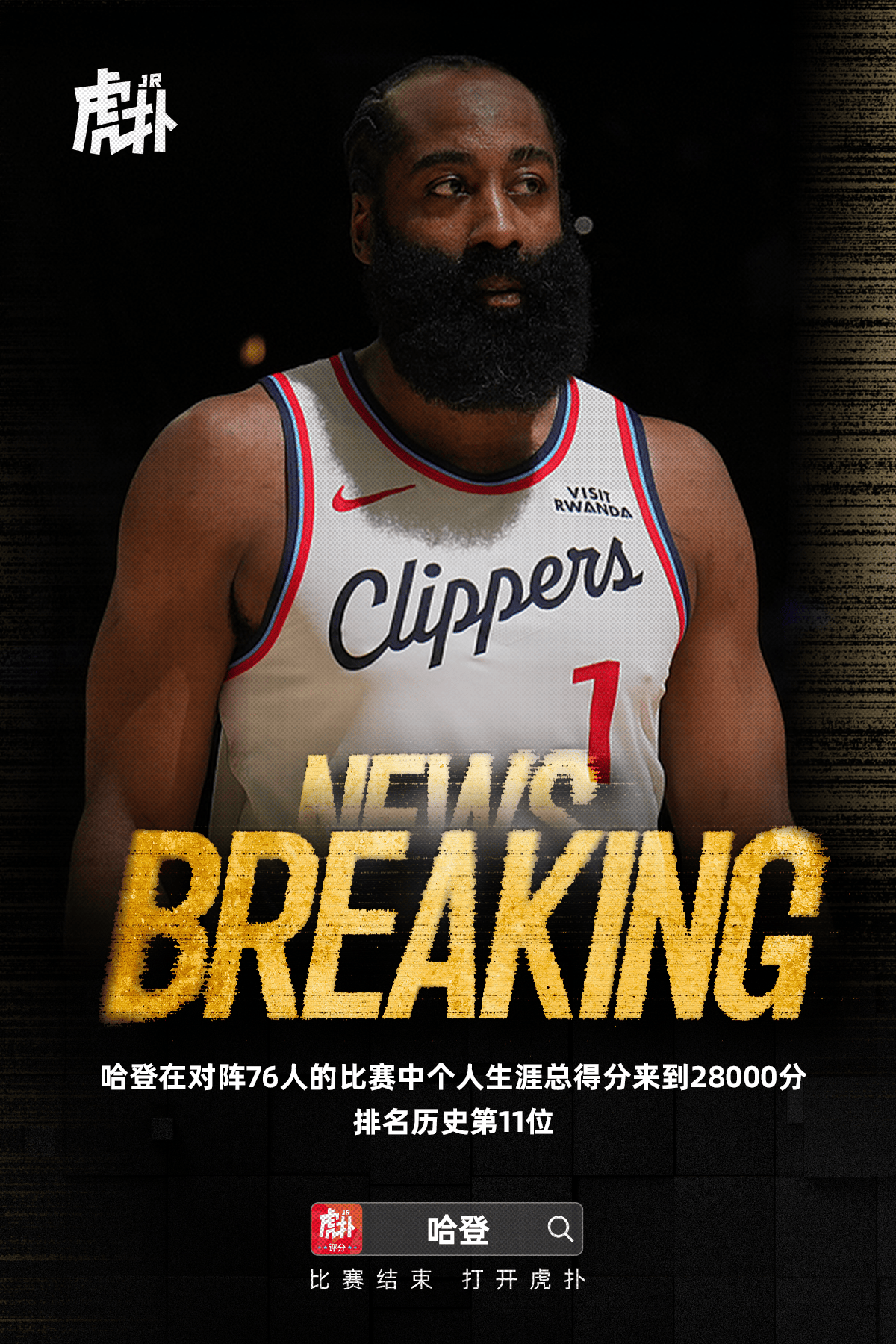 比赛的涯总第一节,哈登追身三分命中,排名个人生涯总得分来到28000分,程历史排名历史第11位。碑哈